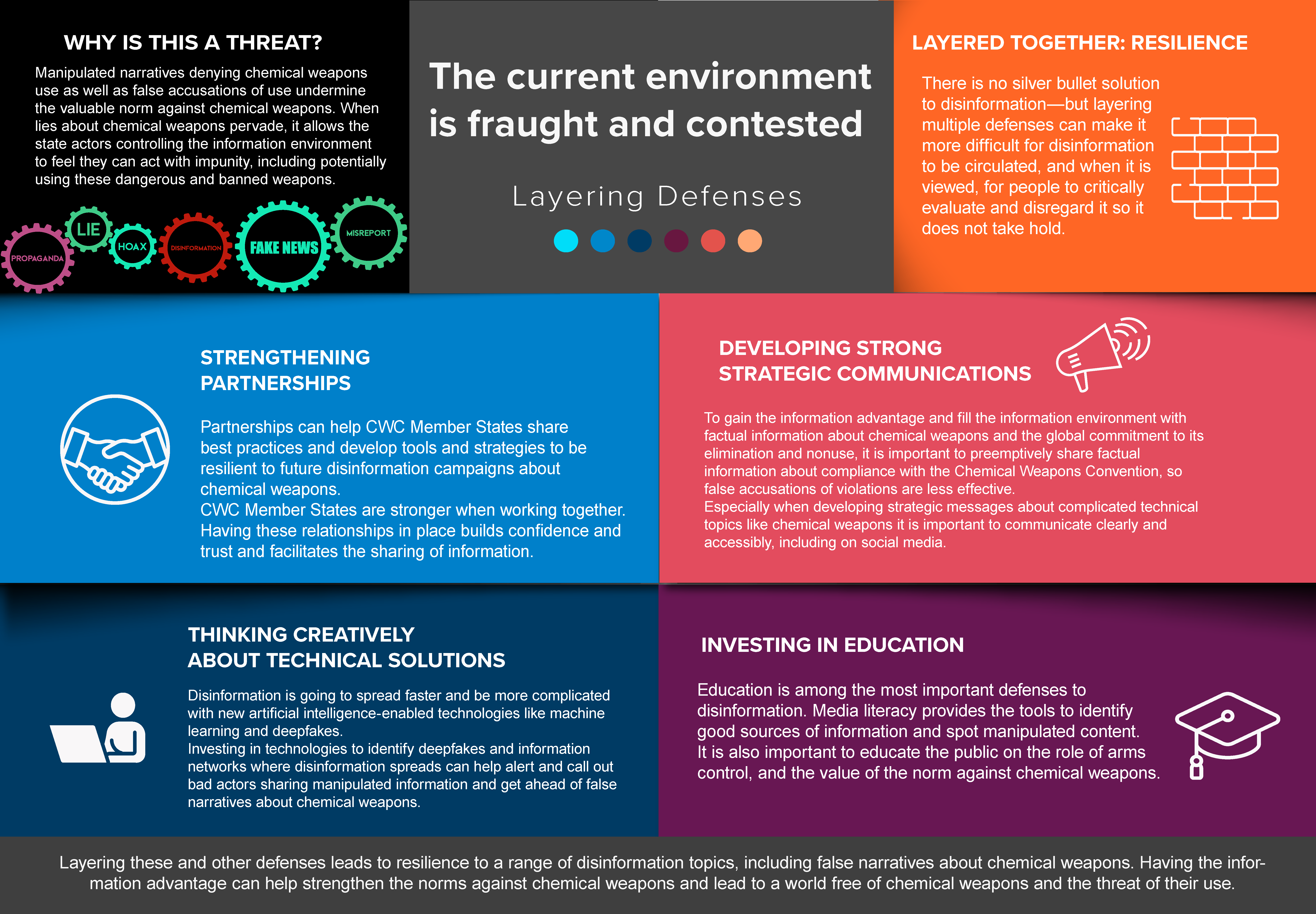 Layering these and other defenses leads to resilience to a range of disinformation topics, including false narratives about chemical weapons. Having the information advantage can help strengthen the norms against chemical weapons and lead to a world free of chemical weapons and the threat of their use.
