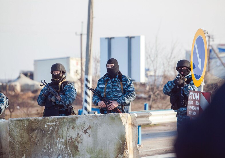 Berkut (Ukrainian riot police) man checkpoint at entrance to Crimean Peninsula
