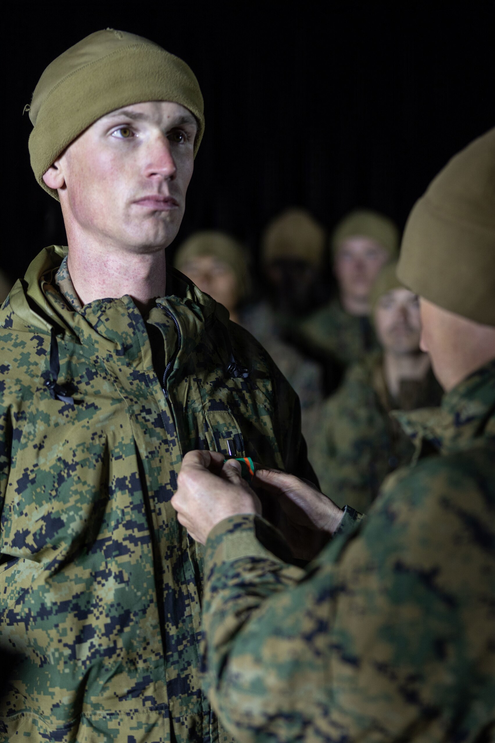 U.S. Marine Corps 1st Lt. Connor Rooney, left, a logistics officer with Combat Logistics Battalion 24, Combat Logistics Regiment 27, 2nd Marine Logistics Group, is awarded the Navy and Marine Corps Achievement Medal during CLB-24's Warrior’s Night as part of Mountain Training Exercise 1-26 at Marine Corps Mountain Warfare Training Center in Bridgeport, California, Feb. 10, 2026. Warrior’s Night is a tradition that usually follows major training exercises and is held to build camaraderie and celebrate accomplishments while honoring unit history through ceremony, toasts, and shared activities. Exercises like MTX 1-26 prove Marines’ ability to provide flexible and responsive combat service support during high intensity combat operations in contested and mountainous terrain. Rooney is a native of Illinois.