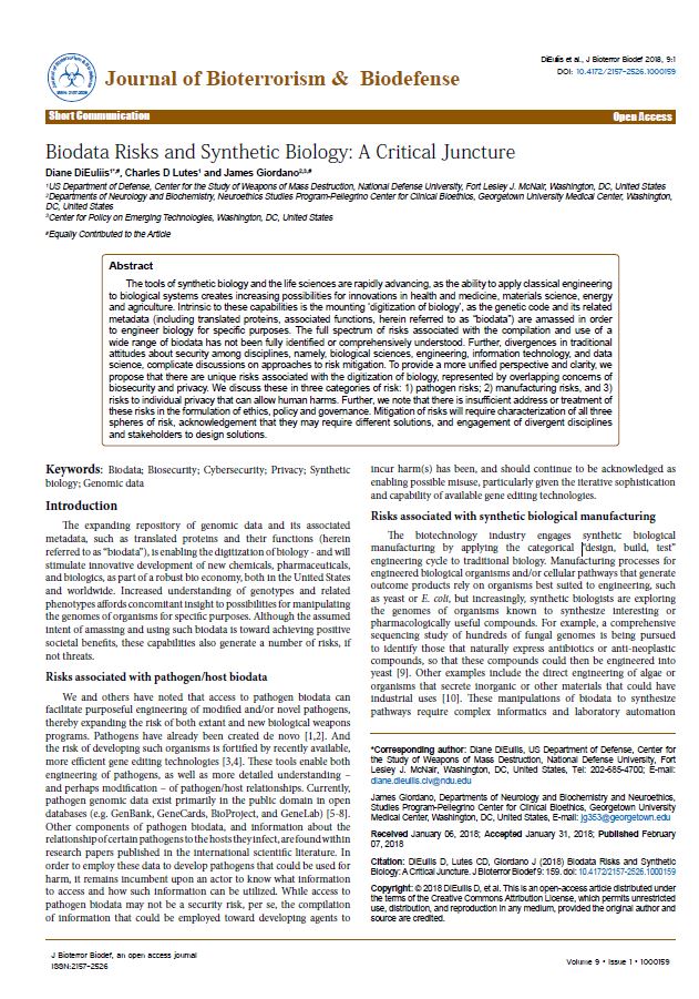 The tools of synthetic biology and the life sciences are rapidly advancing, as the ability to apply classical engineering to biological systems creates increasing possibilities for innovations in health and medicine, materials science, energy and agriculture. Intrinsic to these capabilities is the mounting "digitization of biology," as the genetic code and its related metadata (including translated proteins, associated functions, herein referred to as “biodata”) are amassed in order to engineer biology for specific purposes. The full spectrum of risks associated with the compilation and use of a wide range of biodata has not been fully identified or comprehensively understood. Further, divergences in traditional attitudes about security among disciplines, namely, biological sciences, engineering, information technology, and data science, complicate discussions on approaches to risk mitigation. To provide a more unified perspective and clarity, we propose that there are unique risks associated with the digitization of biology, represented by overlapping concerns of biosecurity and privacy. We discuss these in three categories of risk: 1) pathogen risks; 2) manufacturing risks, and 3) risks to individual privacy that can allow human harms. Further, we note that there is insufficient address or treatment of these risks in the formulation of ethics, policy and governance. Mitigation of risks will require characterization of all three spheres of risk, acknowledgement that they may require different solutions, and engagement of divergent disciplines and stakeholders to design solutions. READ MORE >>>
